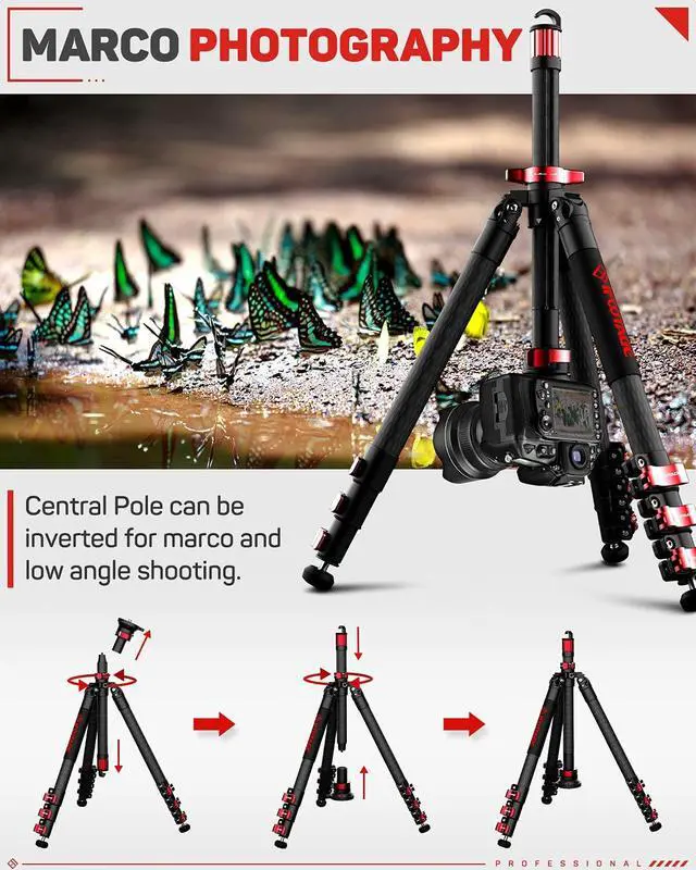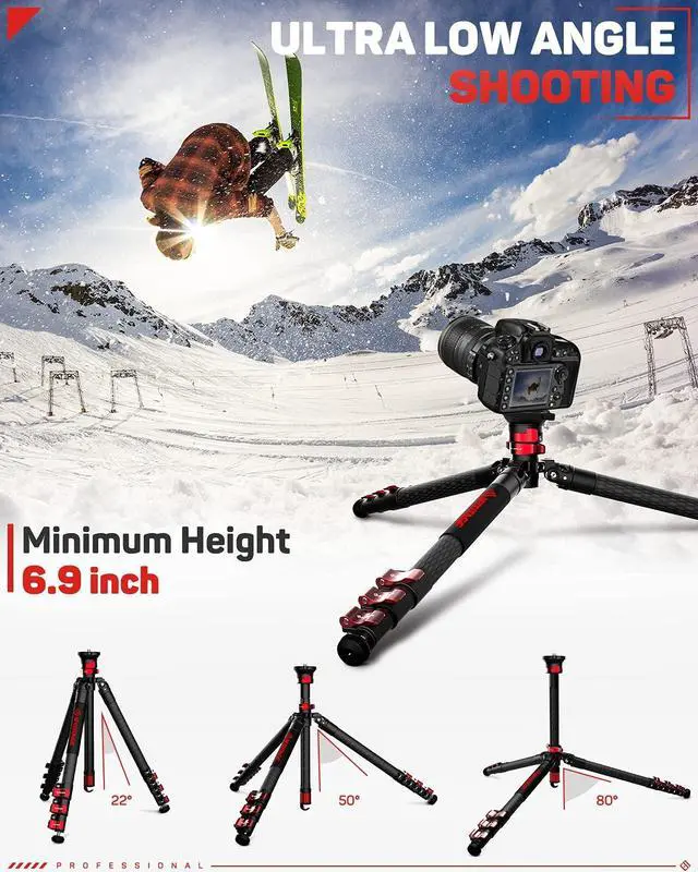 Ultra Low Angle Shooting: The leg spread come with adjustable angle of 80 on this means it offers lower shots minimum height of 6.9 inches than many other competitors tripods-useful when you are on location and need a steady low angle shot.