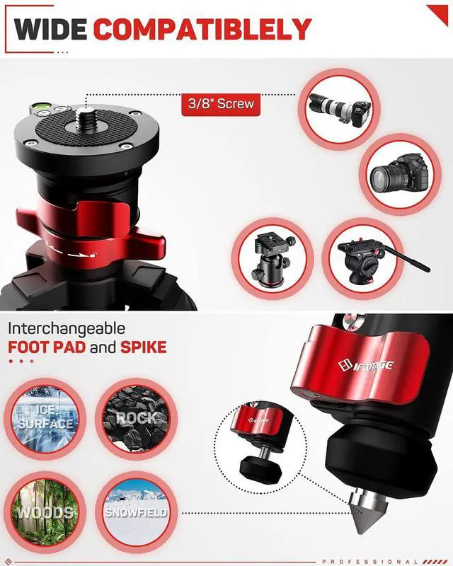 ^^ Strong Stability: Made of carbon fiber, features a 75mm adjustable bowl head. Max load capacity is 13.2 lbs for handling larger cameras and lenses. Also comes with handy hook for additional weight stability.
