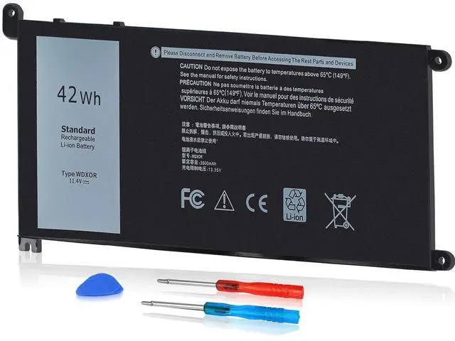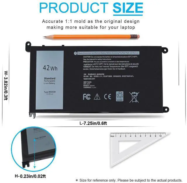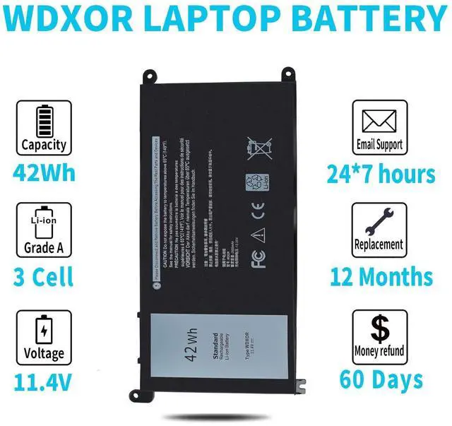 SPECIFICATION : Model Name: 42Wh Standard Rechargeable Li-ion battery Type WDXOR ; Battery Type: lithium ion; Voltage : 11.4V; Capacity : 42Wh; Cells: 3-cell; Weight: About 9OZ / 0.56 lb; Size about 7.25x3.82x0.23in; Condition : Brand New; Battery life: Up to 600 discharge/c