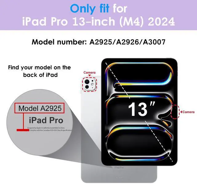 Compatibility - Specifically Designed for iPad Pro 13-inch (M4) 2024 released (Model Number: A2925/A2926/A3007).Please check back bottom of your iPad to find the model number