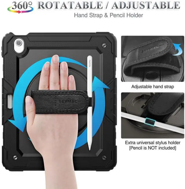 SEYMAC stock Case for iPad Air 13 inch Case M3/ M2 (2025/2024), for iPad Air 6th Generation, Heavy Duty Protective with Pencil Holder, Screen Protector, Stand, Hand Strap, Shoulder Strap, Black