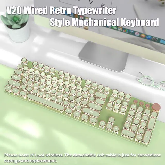 TISHLED Typewriter Style Mechanical Gaming Keyboard White LED Backlit 104-Key NKRO Pink Switches Retro Round Keycaps Golden Ring Volume Knob Metal Panel Wired USB-C Detachable Cable, Matcha Green