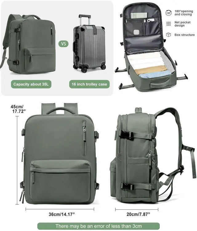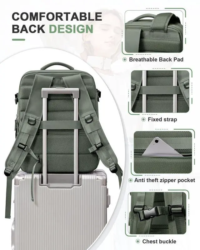 [(Multi functional backpack design)] Designed specifically for travelers, this backpack features multiple compartments and pockets, including a large main space that easily accommodates clothing and personal items needed for 3-5 days. It also comes with an easy to access front pocket for storing important documents such as boarding passes and passports, and an independent laptop pocket. It also has an anti-theft pocket on its back, which can store personal valuables.