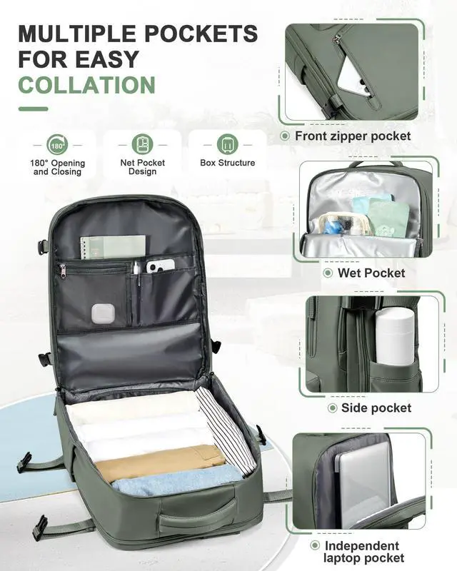 VGCUB Travel Backpack for Women Men for Spirit Airlines Personal Item Bag 18x14x8 Inches Laptop College Backpack,Waterproof Carry on Flight Approved Work Backpack Mochila de Viaje,Large Army green
