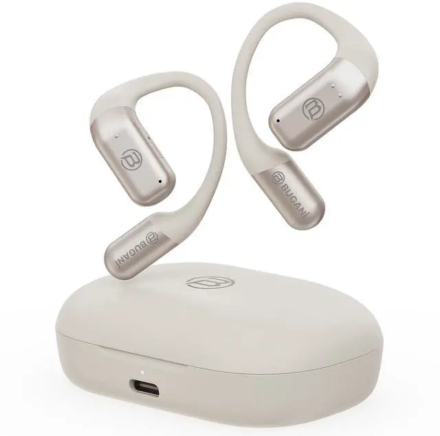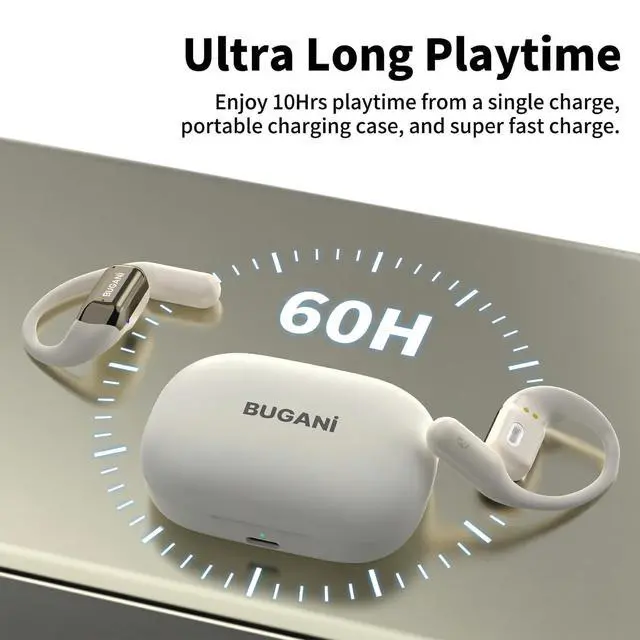 OPEN-EAR DESIGN FOR COMFORT & SAFETYUnlike traditional in-ear earbuds, BUGANI open ear headphones rest gently on your ears without entering the ear canal, ensuring a pain-free experience for all-day wear. This innovative design allows you to enjoy premium audio while staying perfectly aware of your surroundings, maximizing your safety during running, cycling, and outdoor workouts. ^^ ENC NOISE CANCELING MIC FOR CLEAR CALLSEquipped with an advanced built-in microphone and Environmental Noise Cancellation (ENC) technology, these wireless earbuds effectively filter out background noise. Whether you are in a noisy gym, on a windy street, or in a busy office, your voice is captured and transmitted with crystal clarity for uninterrupted hands-free calling.