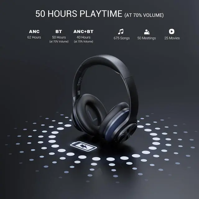 Battery Life: Ultra-long noise cancelling time with up to 62 hours of playtime in ANC mode (Power off). Enjoy 50 hours of playtime in Bluetooth mode (70% volume). The 5-minute quick charge delivers 2 hours of playbackperfect for travel and daily use. ^^