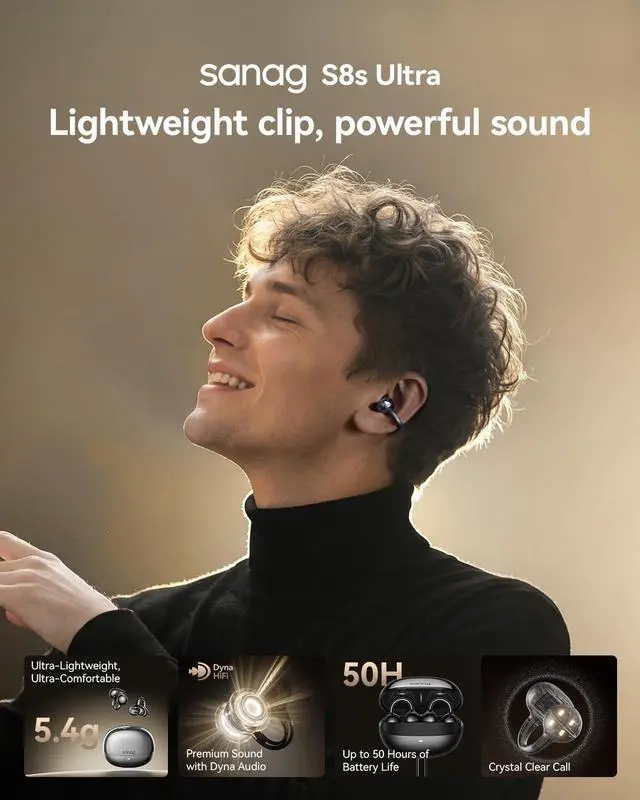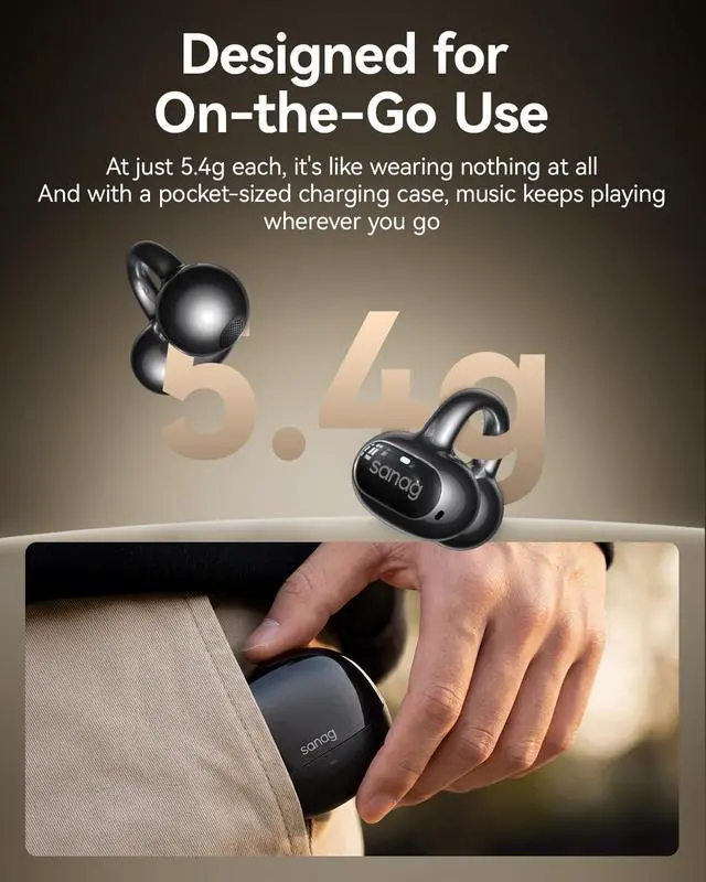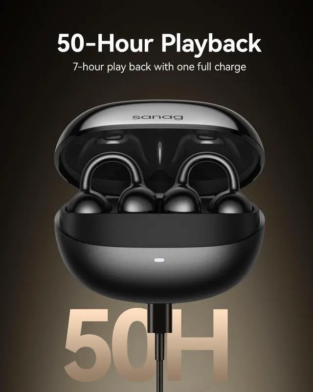 AI REAL-TIME TRANSLATOR AND SMART DIALOGUE: SANAG wireless earbuds feature advanced AI translation technology with multi-language support and scene-specific translation. Perfect for international business, travel, study, and daily communication. Break language barriers effortlessly while enjoying premium audio. Compatible with iPhone, Samsung, Android and all Bluetooth devices. Trust SANAG for smart audio innovation. ^^ COMFORTABLE CLIP DESIGN AND ULTRA-LIGHT 4.5G: SANAG open-ear clip headphones adopt ergonomic design that gently clips onto your ear without pressure or pain. With only 4.5 g weight per earbud, you'll barely notice them. Perfect for all-day wear at work, gym, running, or travel without ear fatigue or discomfort. Secure fit won't fall out during intense exercise. Experience the SANAG difference in comfort. ^^ 50