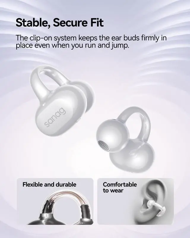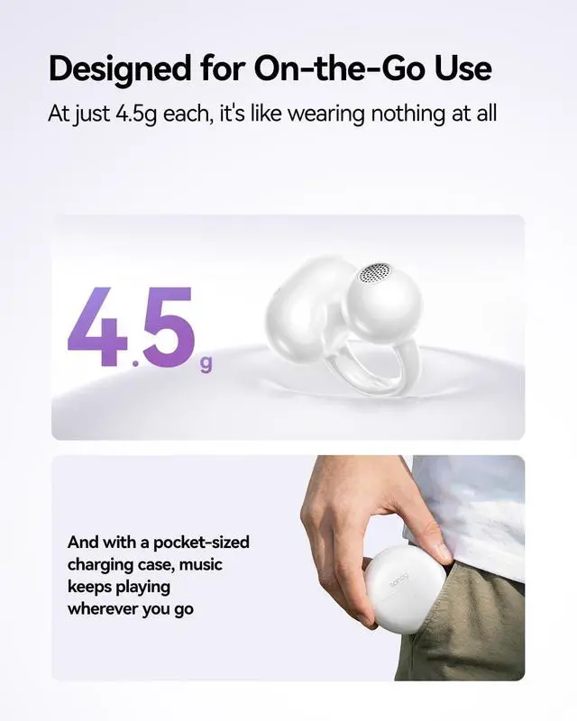 COMFORTABLE CLIP DESIGN AND ULTRA-LIGHT 4.5G: The open-ear clip headphones adopt ergonomic design that gently clips onto your ear without pressure or pain. With only 4.5g weight per earbud, you'll barely notice them. Perfect for all-day wear at work, gym, running, or travel without ear fatigue or discomfort. Secure fit won't fall out during exercise.