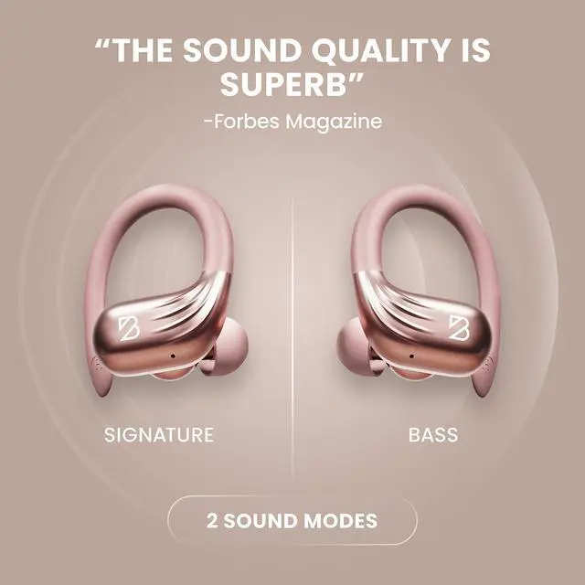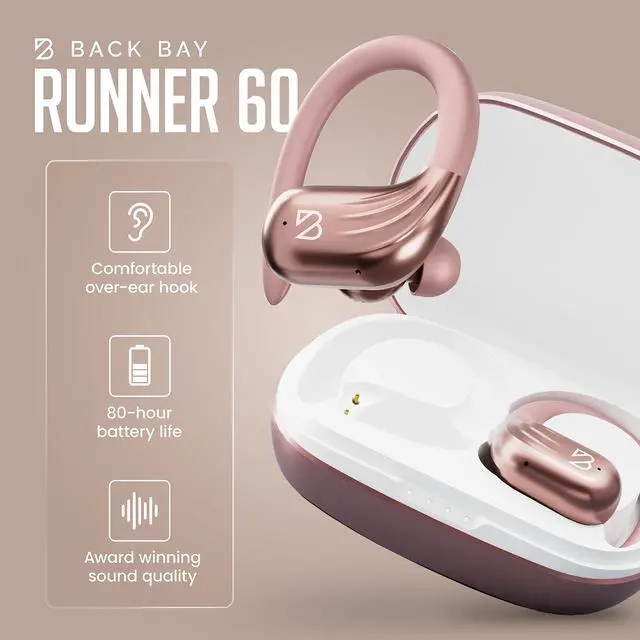 [Secure Fit - Built For Runners] These running earbuds were designed with the input of hundreds of runners, creating the ultimate Bluetooth headphones for running; their comfortable ear hook create earbuds that don't fall out during a run or workout ^^ [Waterproof] Take these waterproof Bluetooth earbuds on any adventure, rain or shine; The IPX-7 rating means the Bluetooth waterproof earbuds are perfect workout headphones for use while running in the rain; [NOTE: they are NOT designed for swimming] ^^ [80 Hour Battery Life] One charge lasts for 2 months of workouts with these earphones' wireless charging case; Each over the ear bud can play music for 8 hours, and the charging case will recharge them 9 more times for a total of 80 hours of use ^^ [Immersive Audio + Bass Mode] Our wireless headphone's power beats the competition; We tune every wireless earphone in Boston to product truly amazing sound; These wireless ear buds wireless Bluetooth earbuds also have a deep bass boost mode ^^ [1 Year Warranty] Back Bay stands behind the quality of its wireless headphones and will replace them if you have an issue; These wireless headphones for iPhone, Android; The earphones with microphone include 6 tip sizes and a wireless charging case