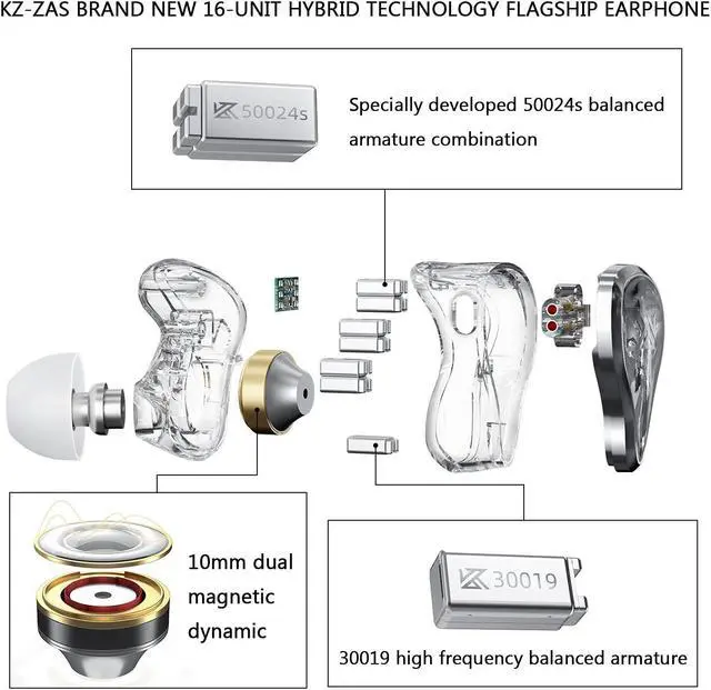 HiFi stereo sound: KZ ZAS in-ear earphones are full of low frequencies and rich in details, 16 units drivers deliver a balanced sound with good bass effect, clear mids and beautiful treble.