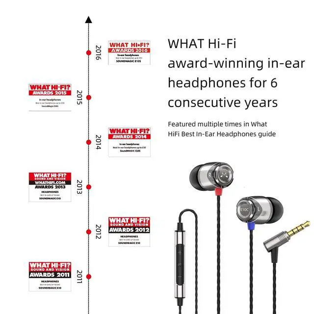 Brand StoryFounded in 2005 by acoustic design engineer Tony Xu. Design and produce products that aim to deliver performance beyond customer expectations. Continuously improving and updating products based on customer feedback. Innovating with the latest technology and best materials. About the SoundMAGIC E10CE10C Winner of the What Hi-Fi ranking "The best headphones at less than 50" six years in a row. Replaces classic headphones and adds all the latest innovations: a solid metal case, powerful bass, balanced listening precision and a striking palette of sounds. With the E10C, SoundMagic has created headphones offering excellent value for money!