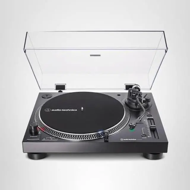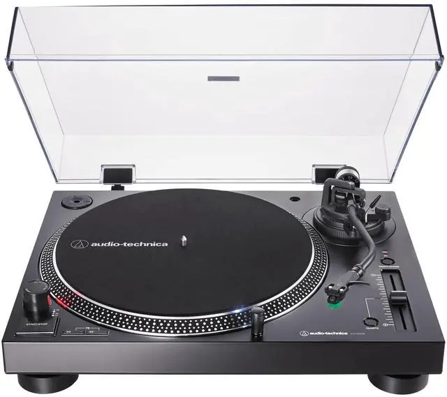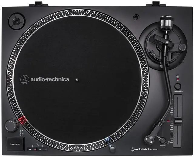 This update of the at-lp120-usb turntable features a new DC servo direct-drive motor along with adjustable dynamic anti-skate control and selectable phono preamplifier The fully manual turntable plays 33-1/3 45 and 78 RPM records and is equipped with a USB output that allows direct connection to your computer Just download the free Mac- and PC-compatible Audacity recording software (or software of your choice) and start converting your records to digital audio files But in addition to the USB output The turntable also comes with a detachable dual RCA output cable and is equipped with a built-in selectable phono preamp so you can connect directly to your home stereo whether it has a dedicated phono input or not The turntable features an S-shaped tonearm with adjustable tracking force and an at-hs6 universal "-mount head shell with an at-vm95e dual Magnet phono cartridge Audio-technical has been a leader in phono cartridge design for more than 50 years and that expertise shows In the versatile high-performance at-vm95e cartridge which comes with a 0 3 x 0 7 mil elliptical stylus but is also compatible with any VM95 Series Replacement stylus offering a wide choice of options for every budget and application Additional features include a die-cast aluminum platter with felt mat a start/stop button selectable high-accuracy quartz-controlled pitch lock and pitch change slider control with +/-8% or +/-16% adjustment ranges a stroboscopic platter with speed indicator a removable plug-type stylus target light external power supply and a removable hinged dust cover Available in black (AT-LP120XUSB-BK) and silver (at-lp120xusb-sv).