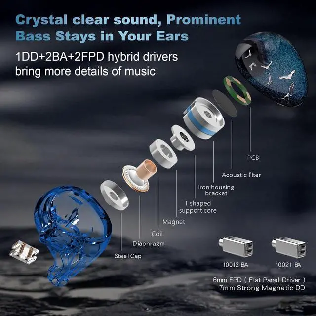 Ear Monitors: Phoenixcall uses a 7mm strong magnetic coil for the low frequencies, a customized BA driver for the mid frequencies, another customized BA driver for the mid-high frequencies, and two Micro planar drivers (Flat panel drivers) for the ultra-high frequencies. Through careful frequency division tuning, it presents characteristics of powerful bass, accurate midrange, and sweet highs, resulting in an overall bright, transparent, and natural sound that is suitable for pop music ^^