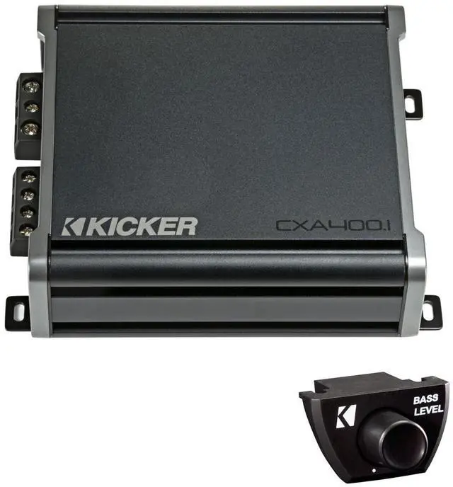 The Kicker 46CXA4001 CXA4001 - 400-Watt Mono Class D Subwoofer Amp and Kicker 46CXARC CXARC Remote Control bundle is a powerful combination designed to elevate your car audio experience. The Kicker 46CXA4001 CXA4001 amplifier packs a punch with 400 watts RMS power output and a Class-D power plant for efficiency. It features a variable bass boost with KickEQ for an extra 6dB of low-frequency response. With up to 40 volts of speaker-level input signal acceptance, this amplifier eliminates the need for line-out converters, optimizing sound quality.
