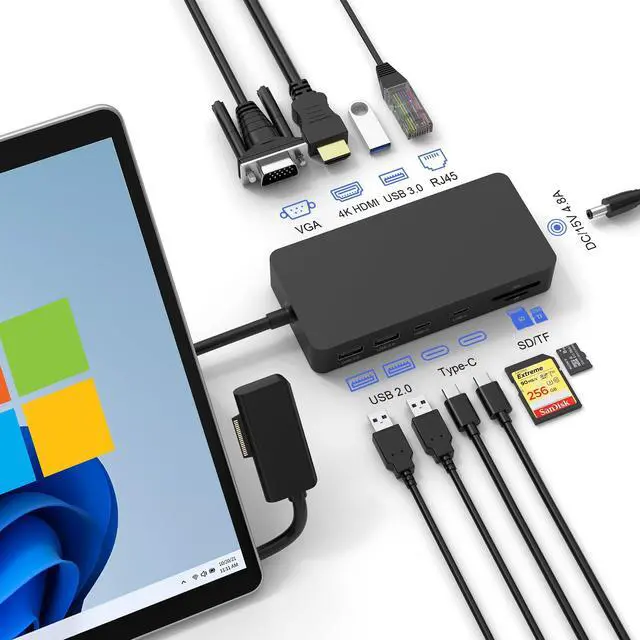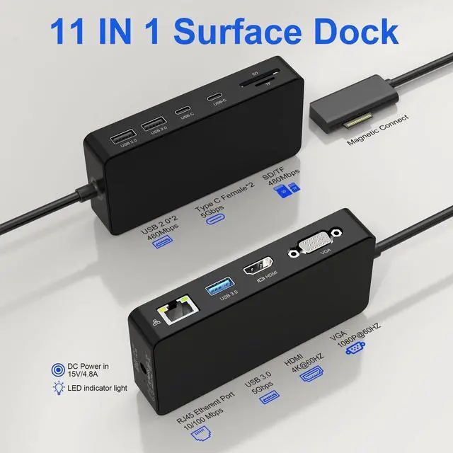 11-IN-1 MICROSOFT SURFACE DOCK: Plug and play. Equipped with Surface Connection technology, simply plug in the Surface magnetic connect cable to charge your device and access external monitors, a keyboard, mouse, and more. This Microsoft Surface docking station with 4K@30Hz HDMI port, 1080P@60Hz VGA port, 100Mbps RJ45 port, 2x Type-C 5Gbps data port, 3x USB A Ports, SD/TF Micro SD card slot and DC Power Port.