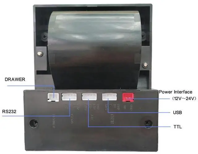 The thermal label paper used by printers is a common thermal paper roll on the market; This thermal label printer supports a wide voltage range from 12V to 24V, and the maximum voltage cannot exceed 24V. It is recommended to use 3A for current; Because the printer is mainly embedded in the equipment, it is equipped with a 2Pin power terminal line. If there is no power supply between 12V and 24V on the upper computer equipment, an external power supply is needed. In this case, an additional 12V~24V DC regulated power supply is needed to connect with the printer.