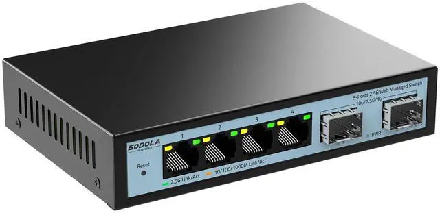 Speed Unleashed:6-Port 2.5GbE Switch features with 4X100/1000/2500M RJ45 ports + 2X10G SFP+ ports for lightning-fast 2.5Gb network connectivity.