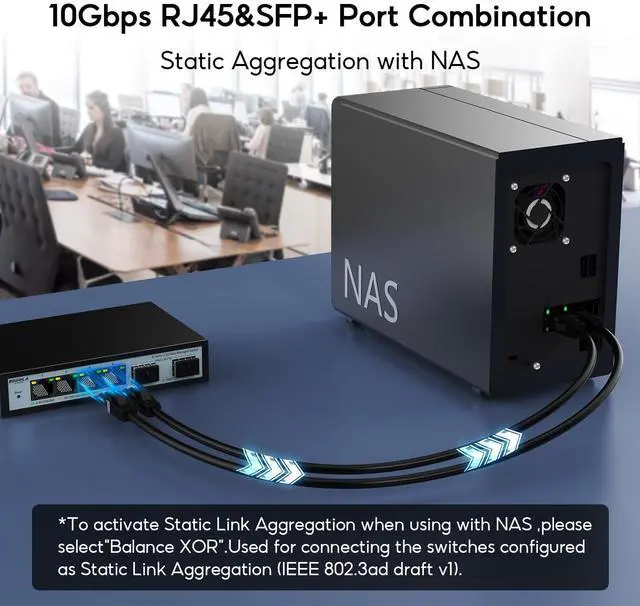 Static Aggregation:Static aggregation boosts throughput and redundancy, ensuring seamless device connections.(Tip: Static Aggregation only, can't be Dynamic Link Aggregation,802.3 ad)