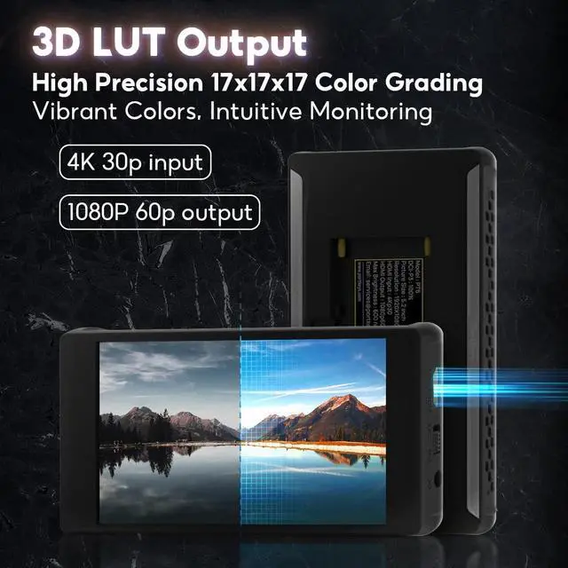 3D LUT Advanced Features:Functions: 3D LUT Output, Anamorphic, New Peaking, Customized Image Crop, Menu Transparency Adjustment, Color Temperature, Zebra, Contrast, Osd Flip, Histogram, RGB & Luma Waveform, Backlight, Zooming, Cross Hair, Grids, False Color, Custom RGB, Sharpness, Chroma, Brightness, Tint, Battery Voltage Checking, Guides, Check Field, Audio Meters, Image Flip