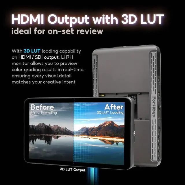 1000nits High BrightPortkeys LH7H 7 camera monitor utilizes a 1000nits panel with low reflection, It offers Rec. 709 color gamut. 7 inch Touchscreen monitor with cool fan ensures a crisp image for outdoor shooting ^^ 4K HDMI & 3D LUTLH7H accept the max 4K 30 FPS signal with 4K 30p HDMI Input and 1080p 60 Out. With 3D LUT function. Easily preview your LUT effect on the monitors ^^ Custom JPG Picture Freeze Frame After capturing an image, it can be compared with real-time video by semi-transparent image superposition(Note: Must be a 16:9 1920x1080 jpg image). Controllable stretching of the images, Real-time monitoring the stretch effects, Stretched legs can be loaded with 3DLUT output from HDMI at 1080P60 ^^ Rugged Construction & LowNoise WorkingMade of robust synthetic plastic, the back shell can reliably protect the internal structure, silent with the fan design, and also provides auxiliary heat dissipation when working. Only 256g very light and portable ^^ Power SupplySupport