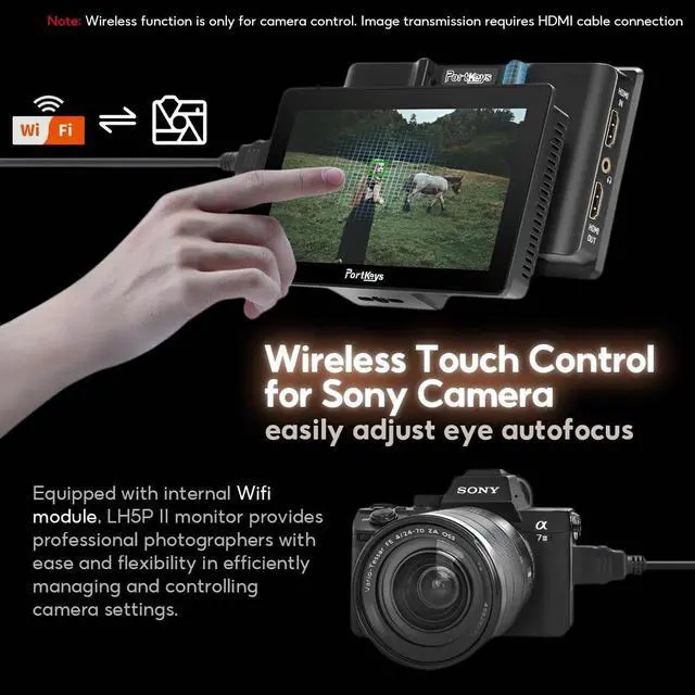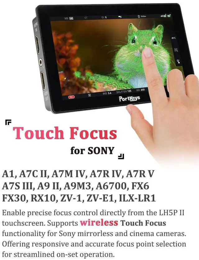 Daylight Viewable & Robust DesignThe LH5P II features a 5.5 -inch 2000 nit ultra-high brightness IPS panel (1920x1080), ensuring crystal-clear monitoring even in direct sunlight. Encased in a durable CNC aluminum alloy frame with a tempered glass front, it weighs only 285g (10oz) perfect for run-and-gun filmmaking on gimbals or shoulder rigs. ^^ Wireless Touch-to-Focus & Camera ControlThe built-in Bluetooth and Wi-Fi module enables Wireless Touch Focus and parameter adjustments (ISO, Aperture, Shutter, REC) for select cameras. Compatible with Sony (A1, A9 II, A7S III, A7 IV, A7C II, FX3, FX30, ZV-E1) and Canon (EOS R5, R6 Mark II, R7, R8).