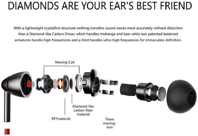 Cutting-edge diamond-like carbon dynamic driver plus 3 fore-cavity balanced armatures deliver incredibly clear sound with all details from each frequency spectrum to others.
