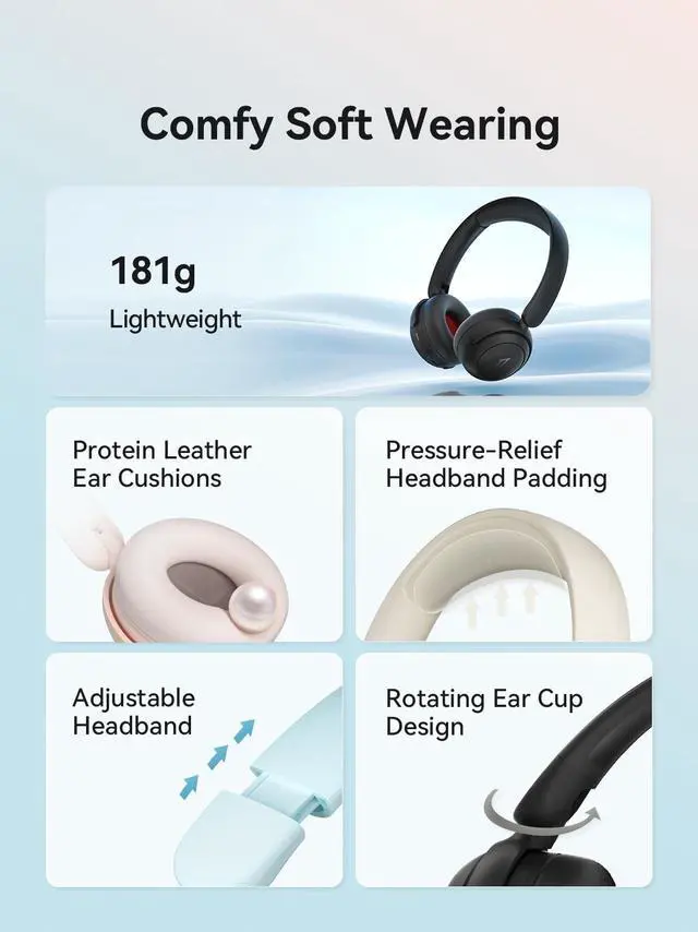 Hearing Protection First These wireless headphones use 3-level automatic volume control to ensure the headphone's sound never exceeds 85dB. The noise-isolating ear cups on these bluetooth headphones reduce background noise by 60%, helping your child focus on homework or online classes. ^^ 65-Hour Playtime + Quick Charge These wireless headphones deliver 2 weeks of use on a single charge! With a 5-minute quick charge, the headphones provide 2.5 extra hours of playbackperfect for school days or travel. ^^ Comfortable for All-Day Wear The SonoFlow Mini HQ20 headphones weigh only 181g and feature soft memory foam cushions and an adjustable headband, ensuring these foldable headphones stay comfortable even during long study sessions.