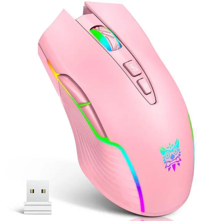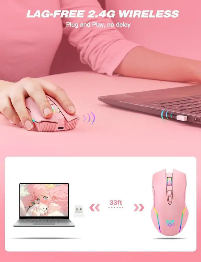 Pink Wireless MouseAdopting 2.4G wireless transmission technology, the wireless mouse provides stable signals as you dive into gaming. It also helps you to clean your desk without the mess. ^^ Dynamic RGB BacklitChoose from 5 RGB backlight effects to add vibrant color to your desktop. RGB light can be switched on/off as per your preference.