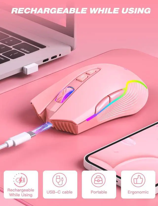 DPI speed switches: 600-1000-1600-2400-3600, you can freely and easily design your own speed in various scenery. ^^ Rechargeable During UseThe pink wireless mouse charges via a USB-C cable. Keep using it while it charges, so you never have to worry about power running out or interrupting you work. ^^ Ergonomic DesignComputer mouse features a ergonomic shape that perfectly conforms to the natural contours of your hand, ensuring long-lasting comfort and productivity. ^^ Wide CompatibilityThe rechargeable wireless mouse is compatible with Windows/Mac/Chrome OS system and supports computer, PC, desktop, laptop, Macbook