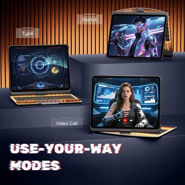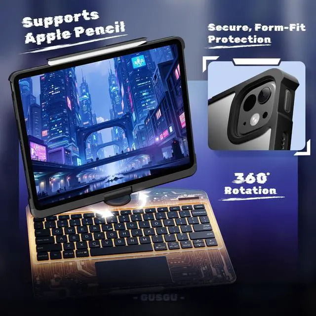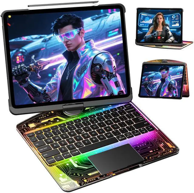 Elevate your iPad experience with our 360 Rotating Keyboard Case. The swivel base offers multiple viewing angles for easy typing, drawing, or watching videos. A transparent hard shell shows off your iPads design while reinforced edges provide solid protection. The acrylic panel reveals the tech-inspired internal circuitry, adding a futuristic touch. Ideal for working, streaming, or browsing, this case transforms your iPad into a stylish and functional workstation, wherever you go.
