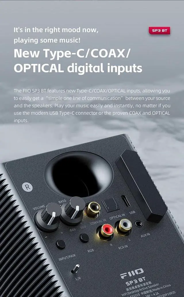 Function: Type-C/COAX/OPTICAL digial imputs. Adjustable bass gain, adjustable LED lighting effect, switchable left and right channels.