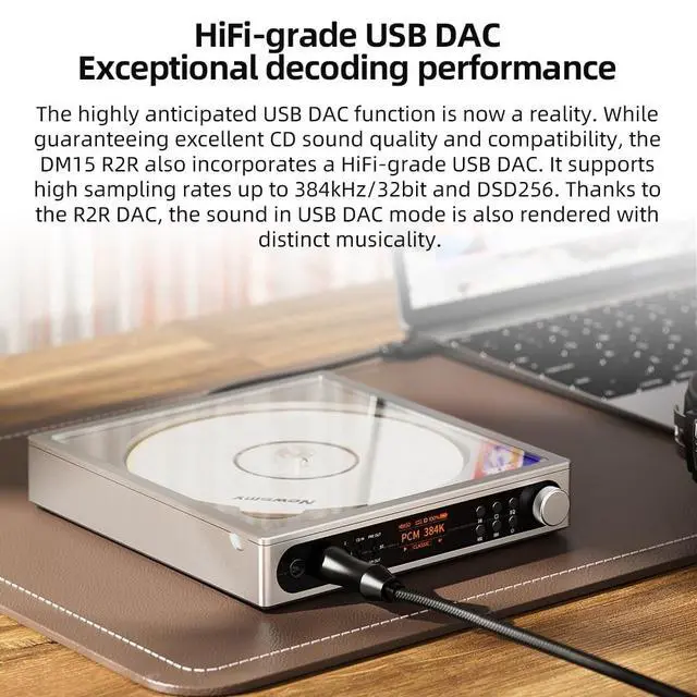 The DM15 R2R also doubles as a high-resolution USB sound card supporting 384kHz/32bit and DSD256, offering a refined digital audio experience through its R2R architecture. With global BASS+EQ controls and 24 customizable sound presets, including a specially tuned RETRO mode, you can easily tailor the sound to your taste. Compact, powerful, and true to the soul of analog audiothe DM15 R2R redefines what a portable CD player can be.