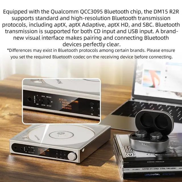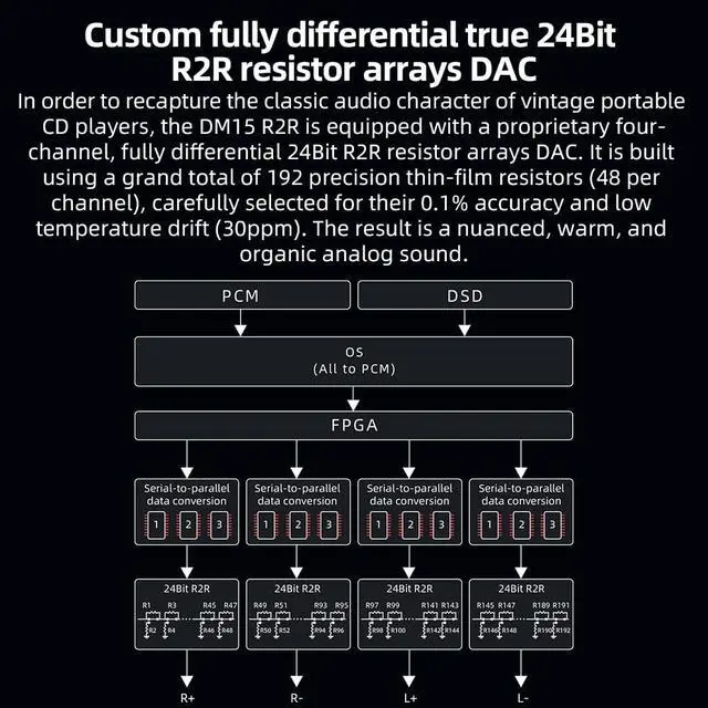 The FiiO DM15 R2R is a truly portable HiFi-grade CD player designed for music lovers who crave authentic analog sound in a compact form. Featuring FiiOs self-developed fully differential 24-bit R2R resistor array DAC, the DM15 R2R restores the warm, natural, and detailed tone of classic CD players using 192 high-precision resistors. Despite its smaller body, the DM15 R2R delivers exceptional powerup to 1150mW + 1150mWcapable of effortlessly driving full-size headphones. Equipped with Qualcomms advanced QCC3095 chipset, it supports aptX Adaptive, aptX HD, and SBC Bluetooth transmission, making wireless streaming smooth and intuitive.