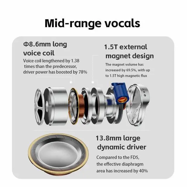 Compared to conventional diaphragm designs of the same size, this innovation increases the effective vibrating area by 30%. The larger effective diaphragm area and greater amplitude enable the acoustic core unit to store more sound energy, delivering a more dense and grounded auditory experience for listeners.