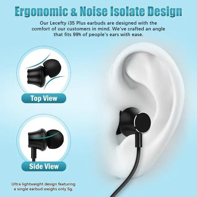 Ergonomic Design -- The Lecefty i35_plus Bluetooth Neckband Earphones have an optimized earbud angle for comfortable fit in the ear canal. Weighing less than 5 grams, they can fit almost all ear shapes. The included three sizes