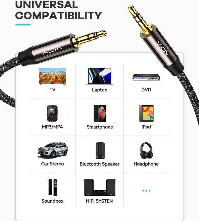 Universal Compatibility: VIOY 3.5mm male to male long aux cable transmits Hi-Fi stereo from aux output (line-out) devices to aux input (line-in) devices without audio converters, such as connecting your laptop/ smartPhone / PC / Tablet with an aux jack to the car stereo audio, TV, headphones, earphones, speakers, amplifiers, soundbar.