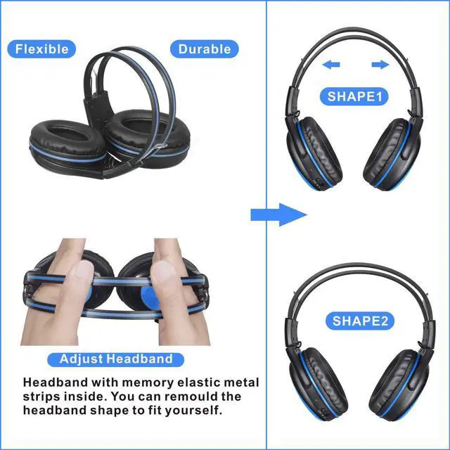 6. There are 2 channels option for the Simolio IR headphones. Set each DVD on a different channel, and the headphone to the channel of the DVD you would like to listen to. 7. The headband incorporates memory elastic stainless steel strips inside, you can remould the headband shape to fit you better, or adjust the wearing angle to make the headphones fit snug on your ears. 8. Automatic shut off function prevents batteries from draining when left on. Pls switch it off first and then switch to A/B when next time to use.