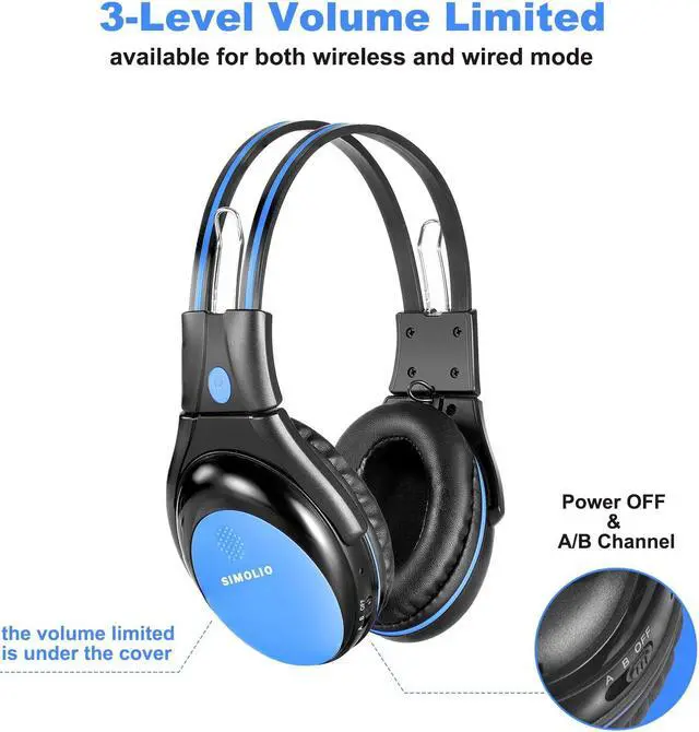 • Two Channel Wireless Kids Headphones with 3 levels Volume Limited Function: designed with a VOLUME LIMITTER SWITCH to limit the output volume at the desired sound level for the Kids. For two kids at the same row watching different movies from the headrest DVD players without interference by switching to A/B channel.