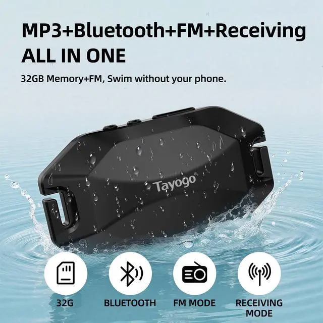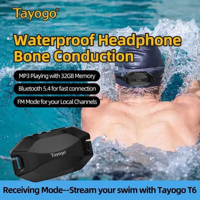 Made for Swimmers No In-Ear, No Falling Off Enjoy your music underwater with Tayogo ROCK PRO W24, the latest bone conduction headphones for swimming. Slide it under your swim cap or attach it to your goggles no earbuds, no pain, and no slipping during turns or dives. ^^ 4-in-1 Waterproof Headphones for Swimming One device, four