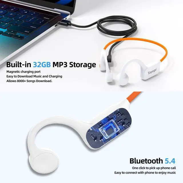 [WATERPROOF DESIGN] This Tayogo bone conduction headphones features fully sealed coating which supports using underwater up to 3 meters. Also this Tayogo IPX8 underwater headphones for swimming has unique MP3 mode which allows you to enjoy music, podcasts, or audiobooks while swimming or other different underwater scenarios. ^^ [Open-Ear Design] Bone conduction headphones, deliver premium audio through the cheekbones, providing clear loud sound reproduction even in noisy environments. The open ear headphones allow you to enjoy music without missing the sound of your surroundings, comfortable listening while doing outdoor workouts. ^^ [Bluetooth 5.4 &32GB of MP3 Player ] Bone conduction earbuds come with Bluetooth 5.4 chip to provide a faster more stable connection.
