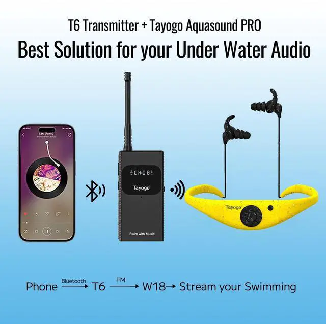 STREAM SPOTIFY & AUDIBLE UNDERWATER: Unlike traditional swimming headphones that require tedious MP3 downloads, the Tayogo T6+W18 combo lets you stream directly from your phone. Simply connect your smartphone to the T6 Transmitter via Bluetooth on the pool deck, and it broadcasts your favorite apps (Spotify, Apple Music, YouTube) directly to your headset while you swim. ^^ SUPERIOR UNDERWATER RANGE (UP