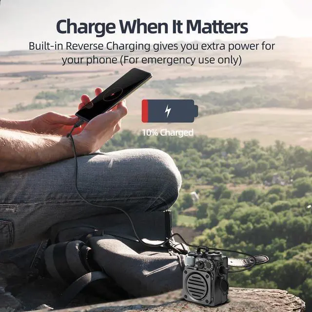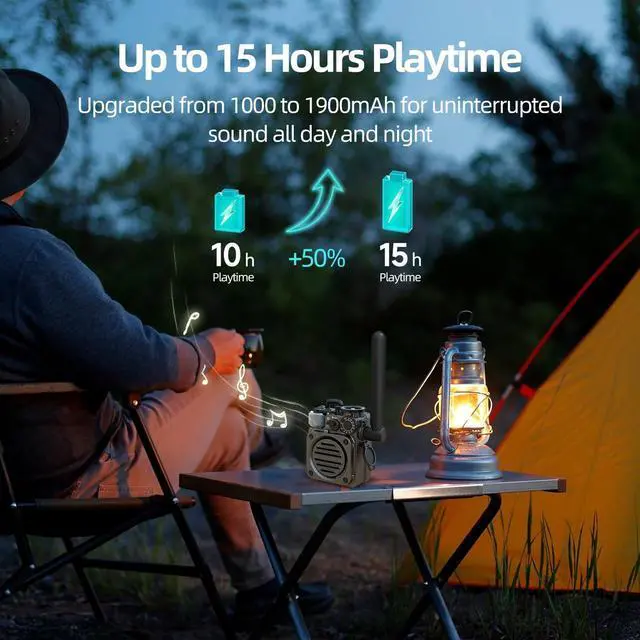 Playtime & Reverse Charging: This small bluetooth speaker features a 1900mAh battery that delivers up to 15 hours of continuous playtime. It also supports reverse charging to provide emergency power to your phone (for emergency use only), ideal for survival situations during long road trips or outdoor adventures. ^^ IPX5 Waterproof with