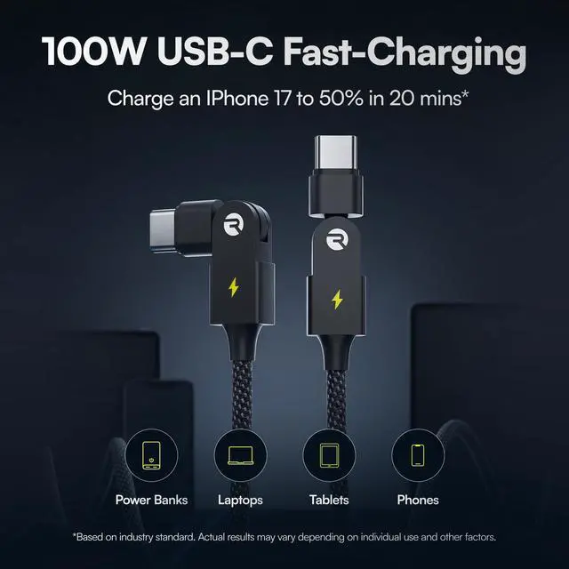 Raycon Magic Spin Cable - USB C to USB C Cable 100W Fast Charging, Type C Charger Fast Charging Cord for iPhone 17/16/15, Samsung, Android, Tangle-Free, Braided Nylon USBC to USBC Cable (Black, 10ft)