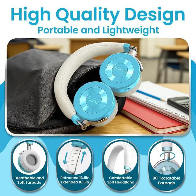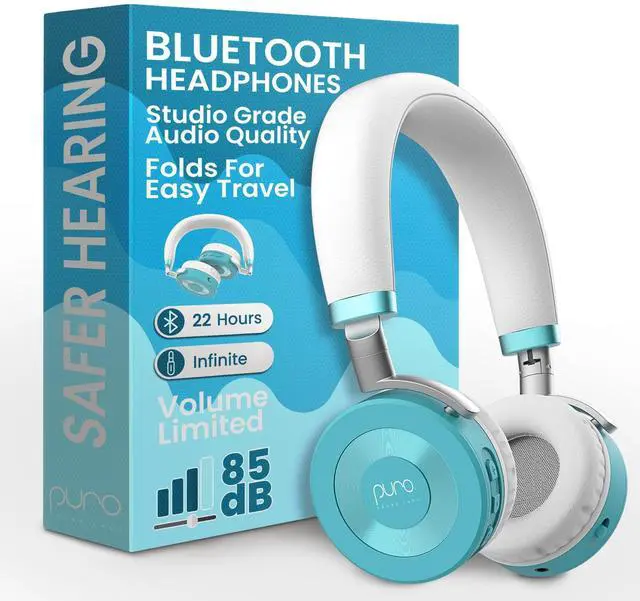 With fast USB-C charging, enjoy up to 22 hours of uninterrupted playtime, ideal for long trips or extended listening sessions without interruptions. ^^ COMFY, ADJUSTABLE DESIGN FOR GROWING KIDS These teal headphones are made for comfort, with plush leather ear cups and a soft headband that make listening a breeze. The lightweight, flexible frame easily adjusts to fit little ones to teens, so they stay comfy even during long listening sessions. ^^ COMMITMENT TO SAFER SOUND At Puro Sound Labs, were dedicated to providing quality wireless headphones for kids that help safeguard their hearing while delivering excellent sound.