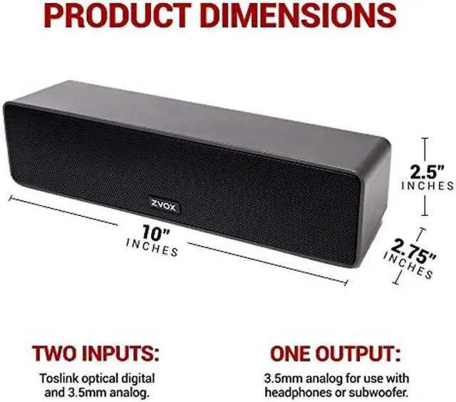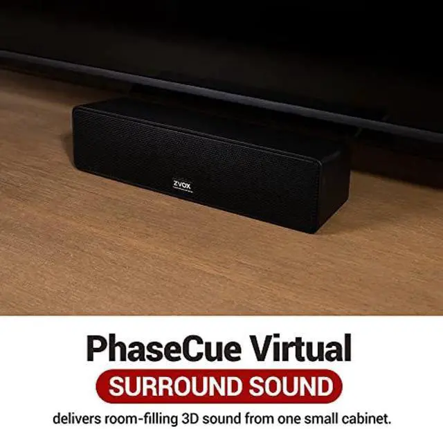 The new ZVOX AV100 AccuVoice sound bar is only 10" wide and 2.25" high - and it weighs less than a pound. But you'll be surprised how big it sounds. Our exclusive PhaseCue virtual surround sound system creates a wide, deep soundstage - it sounds like you are listening to mutliple speakers. You can put the AV100 anywhere. In front of your TV. Under your TV. Above your TV. To the left or right of your TV. With an optional mounting kit, you can even attach it to the top or bottom of most TVs.