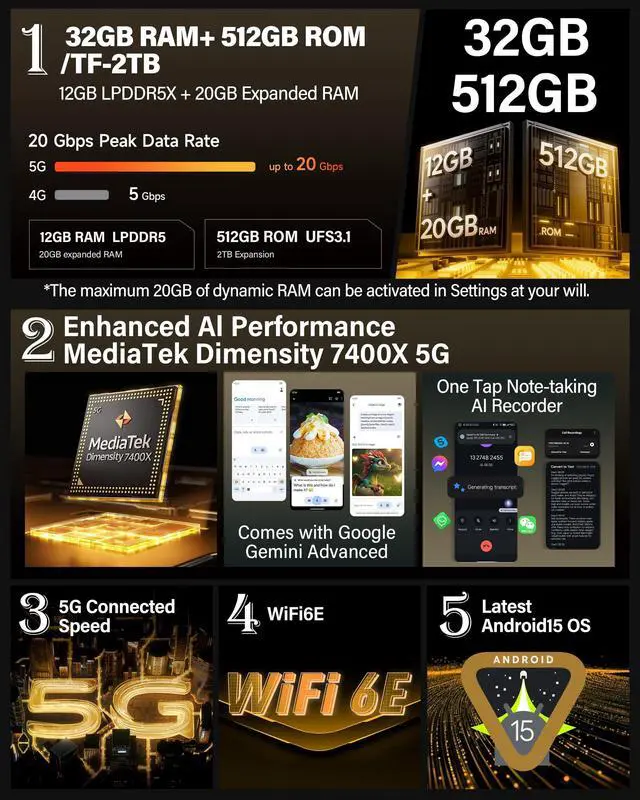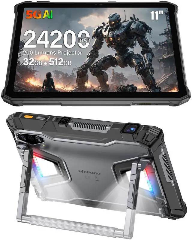(NOTE: Not compatible with AT&T or Cricket. Armor Pad 5 Ultra weighs 1600g( 3.5 pounds), it will be heavier than other tablets) ^^ Built-in 200 Lumens ProjectorUlefone Armor Pad 5 Ultra rugged tablet built-in DLP projector (960*540 resolution). Support smart autofocus, 100% offset and 26 upward throw design, 40 Keystone Correction, 102 dB loudspeaker, One-Key projection, just 2.2 meters to effortlessly project a wide visual of up to 80 inches. Equipped with powerful cooling fan, operating at a powerful 3900 RPM, our device maintains a cool temperature for stable visuals and uninterrupted entertainment. ^^ 24200mAh Battery & 120W Fast ChargerFormidable 24200mAh capacity extended expeditions. Support 120W fast charging and 10W reverse charging. Go from 0% to 20% in just 10 minutes. Ulefone Armor Pad 5 Ultra can work as a power bank to charge other smartphones or devices. ^^ 32GB+512GB ROM & Android 15With 32GB RAM (12GB + 20GB adjustable RAM), 512GB of internal storage, and expandable up to 2TB spares a large room to store apps, photos, videos, and files. Android 15 featuring advanced theft detection. Multitask like a pro with app pairing and enhanced large-screen optimization.