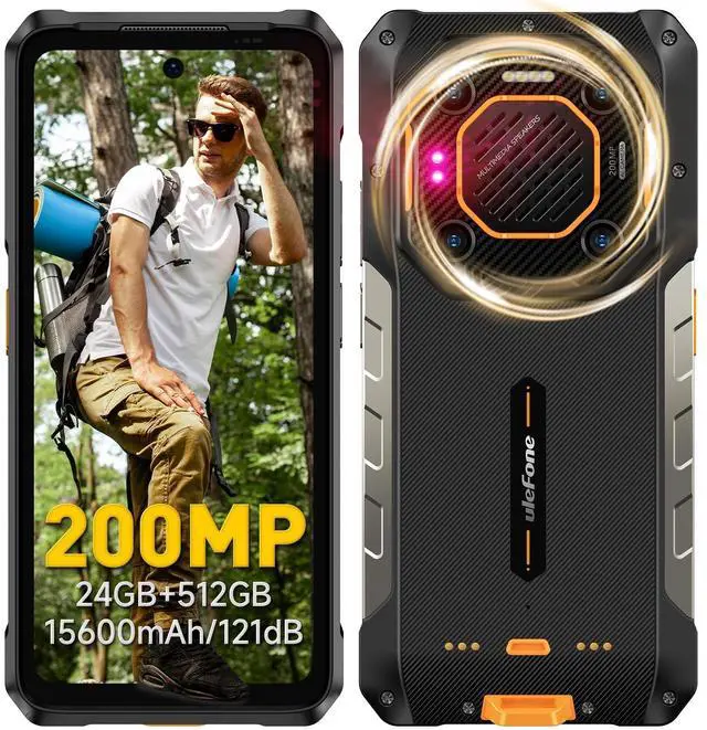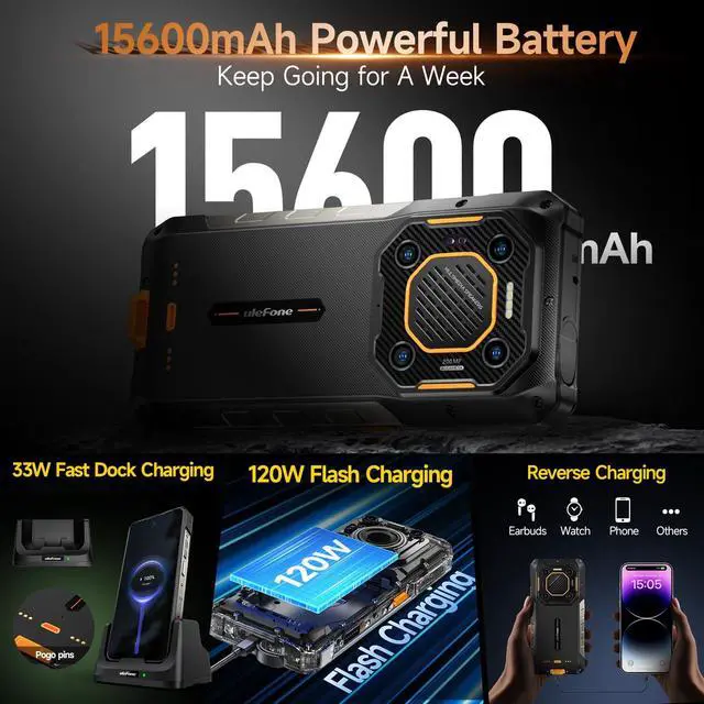 Ultra Size: 7.05 x 3.27 x 1.0 inches, Weight: 609g( 1.34 lb), it will be bigger and heavier than other ordinary phones. ^^ MTK Dimensity 8020 5G & 24GB + 512GB 2.6GH z high-frequency Arm Cortex-A78 8-core CPU comes with powerful Arm Mali-G77 GPU with a leading 6nm process. 12GB RAM (up to 12GB of virtual RAM) allows multiple memory-hungry apps to run snappily at the same time. 512GB of internal storage as well as TF card expansion supported 2TB. ^^ 200MP Quad Camera + 50MP Front Camera200MP Main Camera empowered by Samsung ISOCELL HP3, featuring a 1/ 1.4 -inch ultra-large sensor with / 1.79 aperture. 8MP 3.2 x optical zoom telephoto lens with up to 76mm* focal length, 50MP ultra-wide lens featuring up to 117.3 field of view (FOV), enhanced by macro and ElS algorithm. 64MP Night Vision Camera paired with OMNMSION's advanced OV64B sensor and Ulefone's NightEif Uitra 3.0 algorithm and 50MP Ultra Front Camera. It takes mobile photography to another peak. ^^ 15600mAh + 120W Charging + 33W Dock ChargingArmor 26 Ultra packs a mega battery with a capacity of 15600mAh for 1750 hours standby time, 56 hours call time, 23 hours video playback.