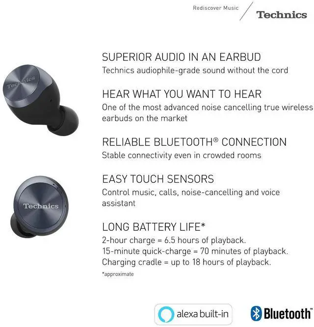 the following: a battery life of up to 7 5 hours (6 5 hours with noise cancelling on), ambient sound mode, touch sensor controls, voice assistant technology (Siri Google Assistant Alexa), a left-right independent signaling system, Technics audio connect app and a find my buds function.