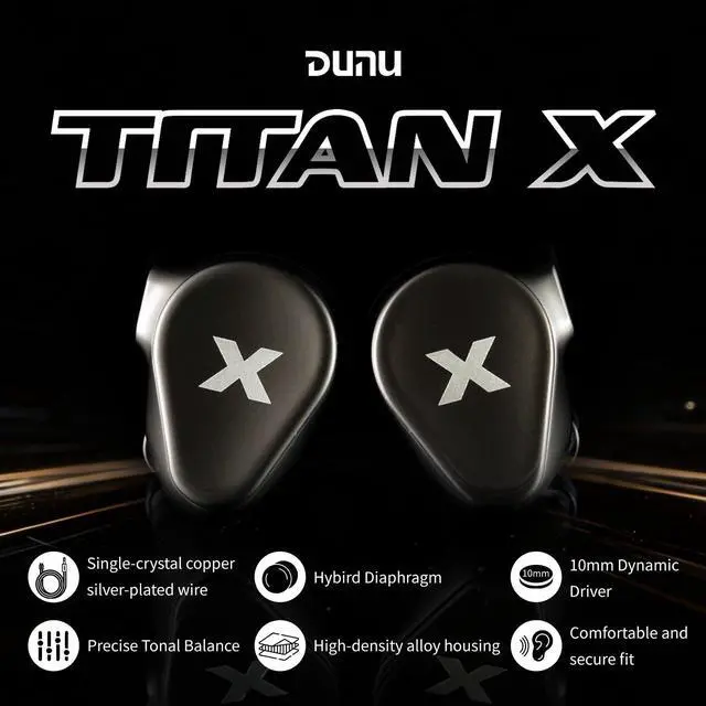 ^^ Balanced, Immersive Audiophile SoundCrafted to the Harman target curve, the Titan X delivers the ideal balance of bass, mids, and treble. Bass hits hard but decays quickly for clear vocals and natural mids, while extended highs reveal micro-details without harshness. Whether youre analyzing a mix or exploring a game, this IEM offers a fatigue-free, immersive listening experience for audiophiles and gamers. ^^ Detachable Cable & Complete Accessory KitUpgrade your listening with Titan Xs premium 4-strand silver-plated cable, designed for durability and superior sound quality. The detachable 0.78 mm 2-pin design allows for easy cable upgrades, while the included silicone eartips provide a comfortable, secure fit, enhancing bass response and isolation.