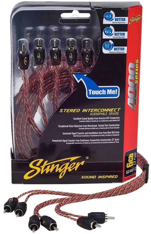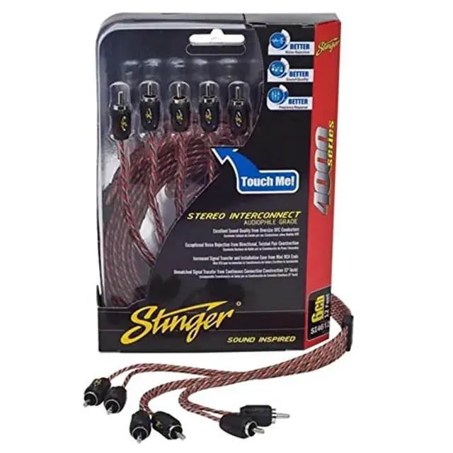Stinger's 4000 series 6 channel interconnects feature directional twisted-pair conductors to shed unwanted interference and have a directional, high-twist construction that retains signal integrity. Separable lettered splitter indicated front (F), rear (R) and sub (S). Each connector has a double molded RCA body with Shoc-Krome end which provides exceptional connection and style. Also, the Shock-Kreme end with split tip delivers performance while preventing corrosion and these cables are ultra compact for easy installation.
